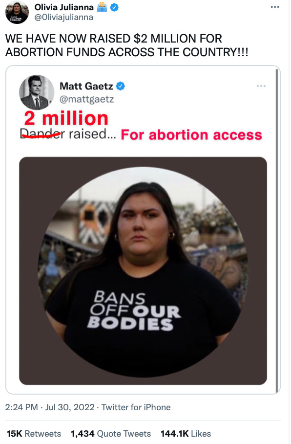Well, Olivia Julianna did not shrink away from the fight. Like a tough Texan, she stood her ground and turned the insults into a fundraiser for abortion access. To date, she has raised more than $2 million! Yes, you read that number correctly.