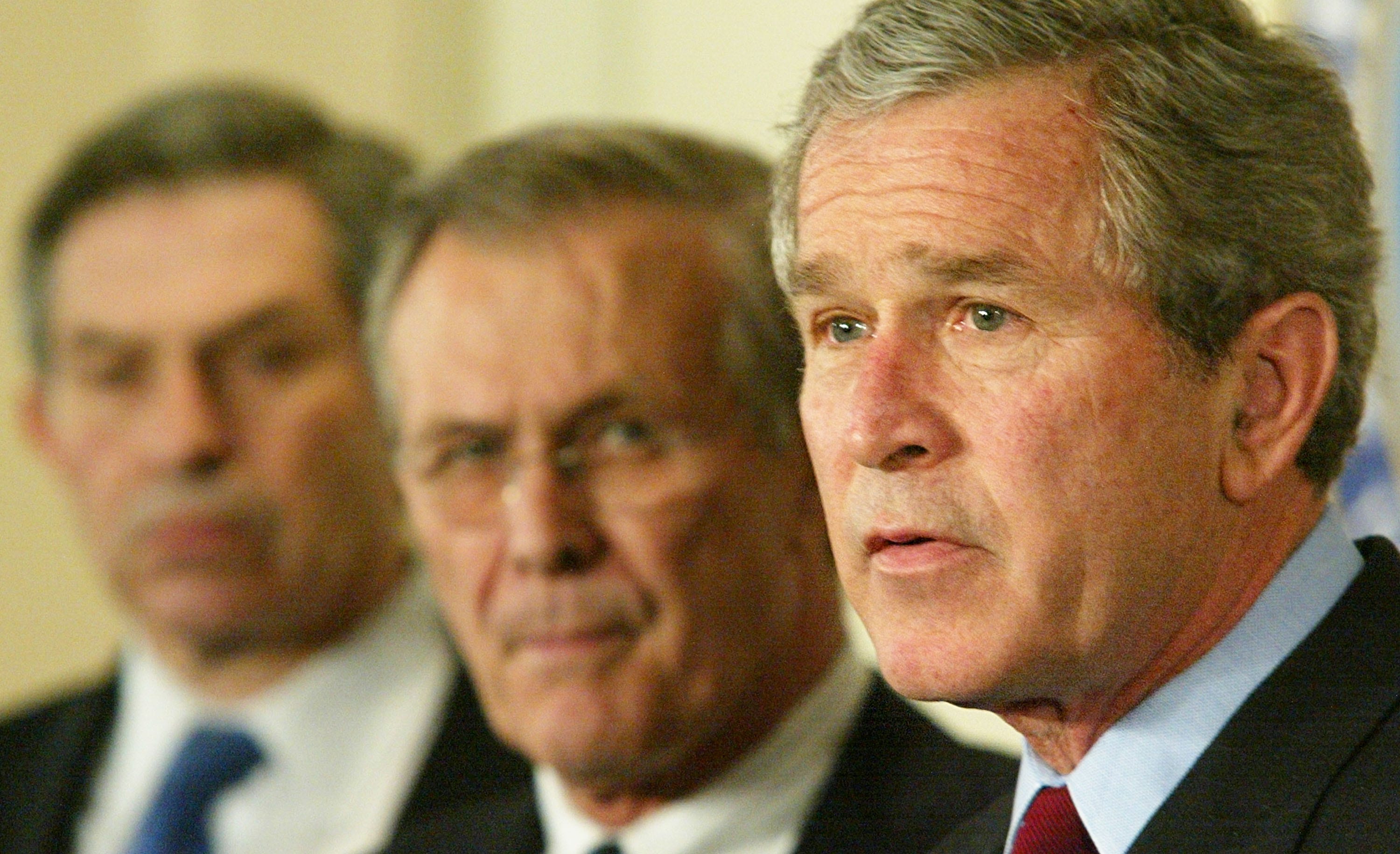 U.S. President George W. Bush (R) speaks next to Defense Secretary Donald Rumsfeld (C) and Deputy Defense Secretary Paul Wolfowitz (L) during a visit at the Pentagon March 25, 2003. Bush asked Congress for a wartime supplemental appropriations of $74.7 billion to fund needs directly arising from the war in Iraq and the global war against terror.