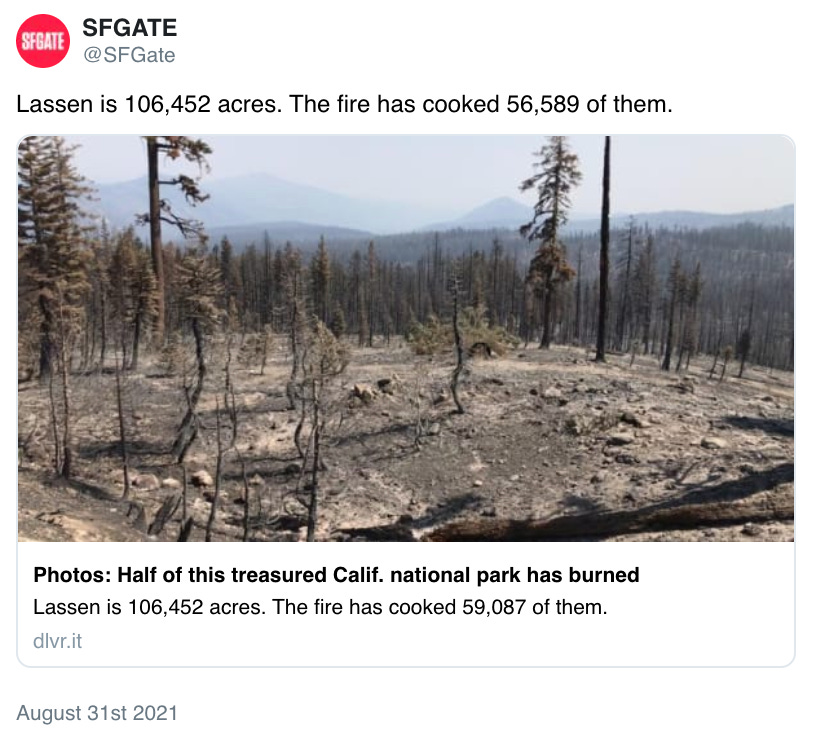 If you were anywhere near Lassen this summer, however, the smell was one of thick smoke and the death of much of what I remembered. Early reports are that more than half of the park was consumed by what is being called the Dixie Fire. When I called my mother to tell her she started crying.