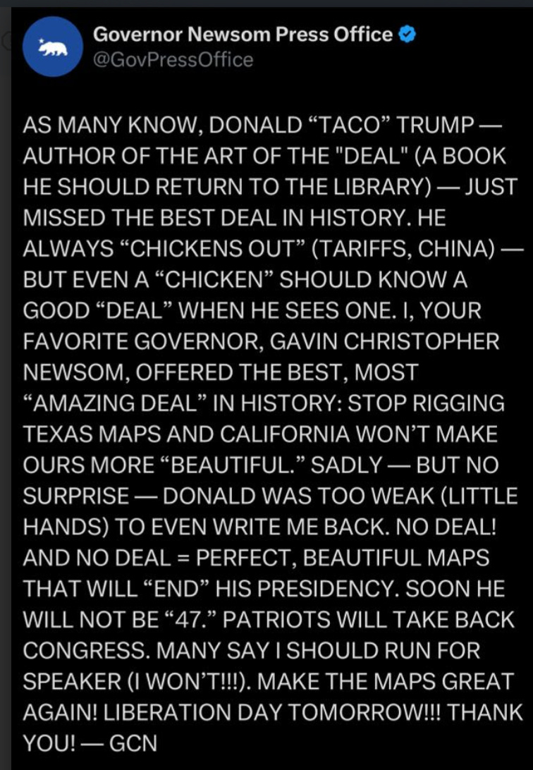 But Newsom hasn’t stopped with his ballot measure. He is now going toe-to-toe with Trump on the digital battlefield, parodying his writing style, trolling his social accounts, and pushing the president’s easily accessible buttons.