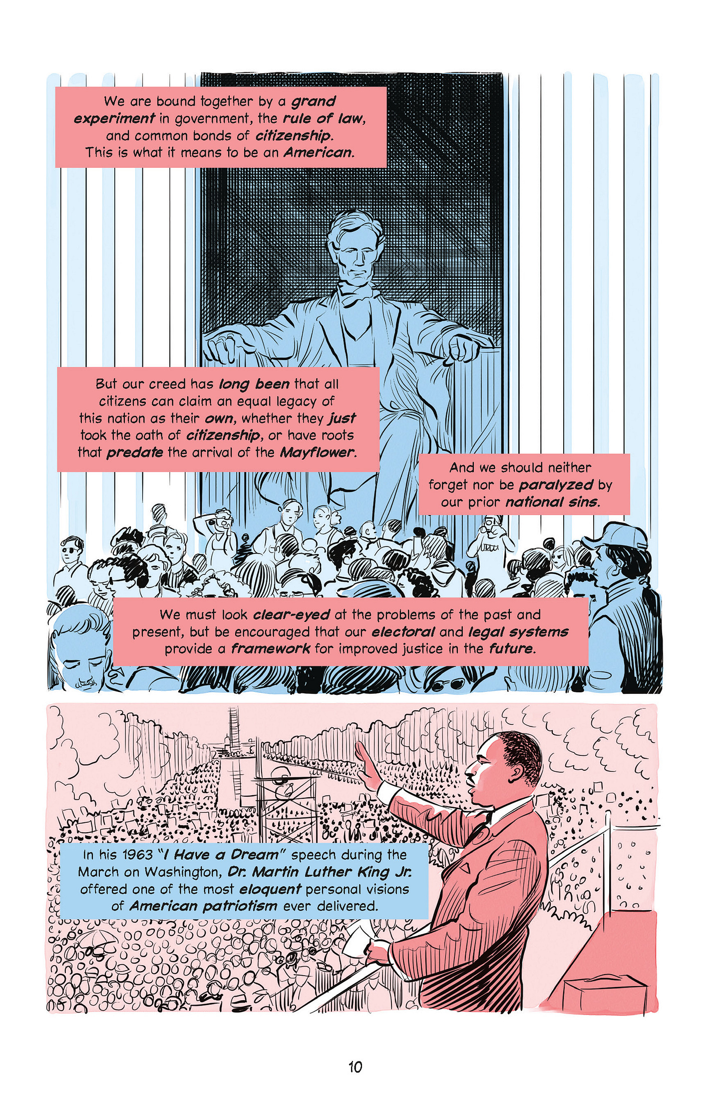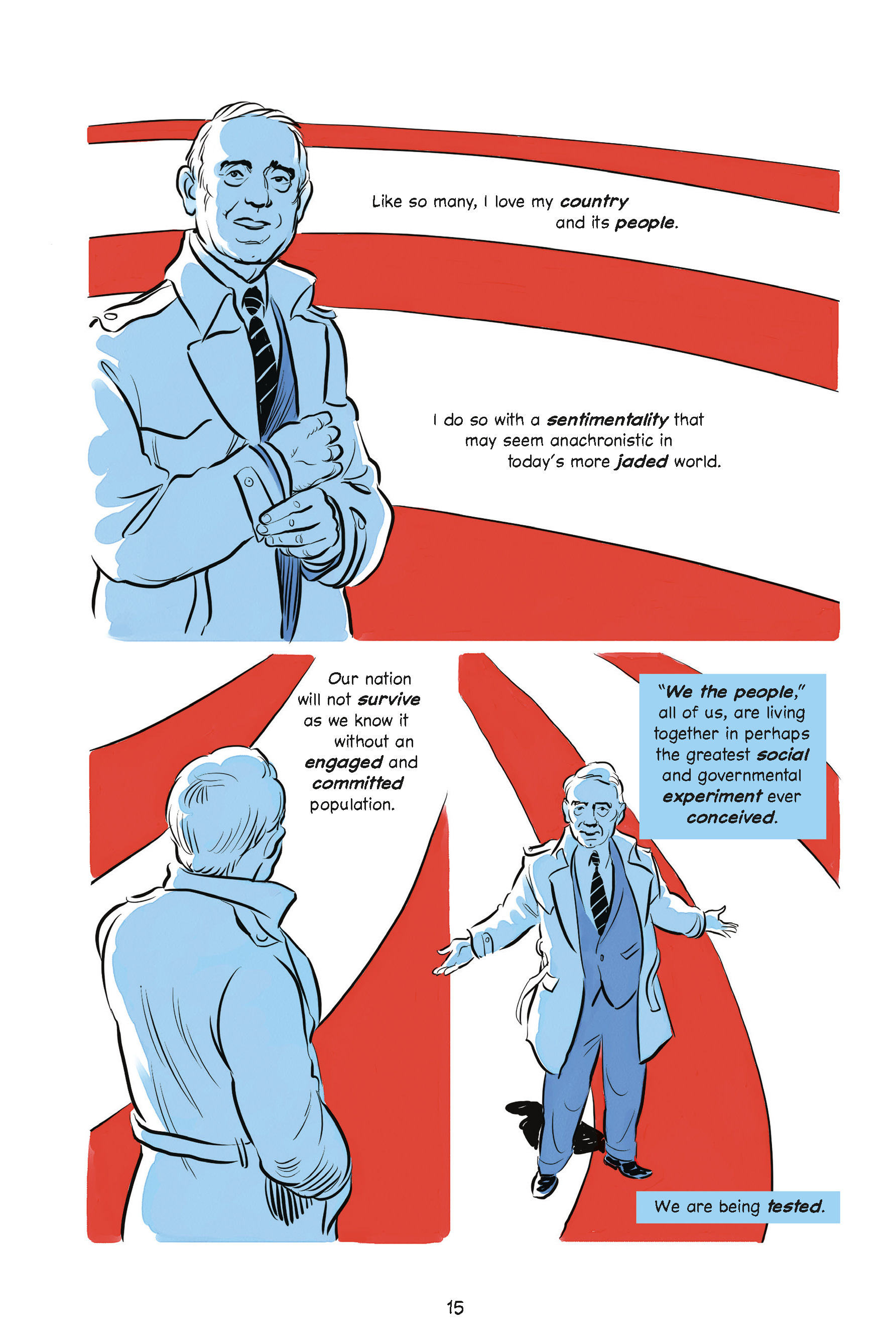 We at Steady have been pleased by the response from many of you to our sharing of short films, and we were looking for something in this vein for the July 4th weekend. That’s when my longtime collaborator Alex Van Amson had what I thought was an inspired idea. It’s not a video, but another medium, and one that I have taken to appreciating only recently. So below is an excerpt from What Unites Us, by way of its graphic novel edition. The power of the images is thanks to the genius of the illustrator Tim Foley. Also a big thank you to my co-author Elliot Kirschner, who also helps here on Steady.