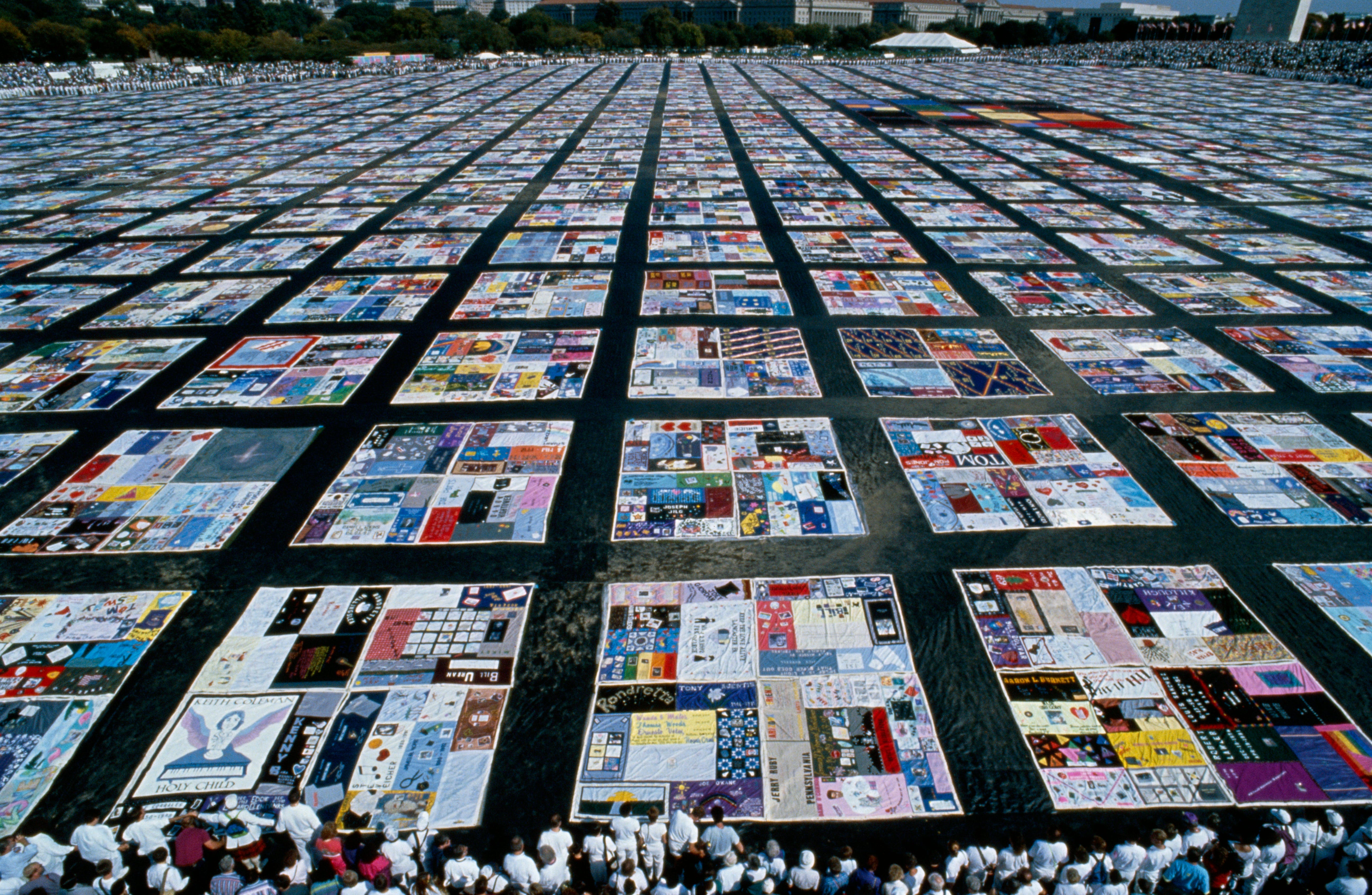 AIDS memorial quilt on the National Mall lawn; 20,000 quilts are displayed.