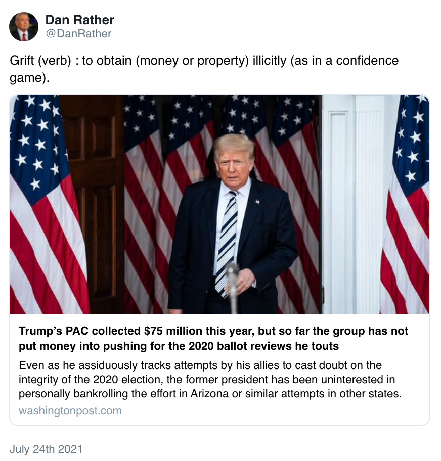 Despite all their efforts to deny truth, push agendas, and support their leader, it seems that Trump supporters are getting the proverbial short end of the stick. While his legion of fans/sycophants are out doing his dirty work, Trump’s PAC is stockpiling funds. Saving for a rainy day, a McDonald’s order, legal fees, or a 2024 White House run? Amidst the countless election challenges and support of the Big Lie, by the numbers it doesn’t look like Trump is putting his money where his mouth is. Put me in the category of unsurprised.