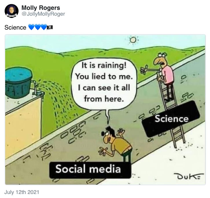 The efforts to recast the events of 1/6 distort reality by creating false narratives. Sadly this playbook is also being used by the same reactionary forces to undermine science - from the climate crisis to vaccines. In science, context and perspective are everything. I was reminded of that again —and couldn’t resist the chance to retweet— when I saw this humorous yet illuminating cartoon. When viewed through a narrow lens, the full picture of science cannot be seen nor understood.