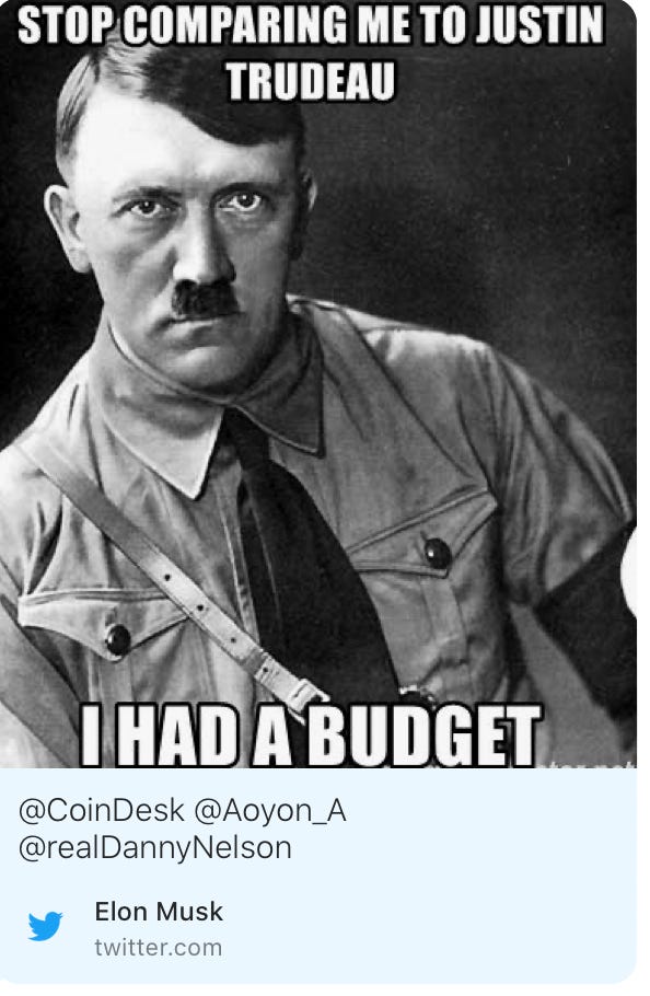 I do not want to get bogged down in the details of cryptocurrency, the Canadian government, or the truck blockade. Those are all important stories that deserve their own treatment. I want to get at something far more basic. There are no words to capture the depravity of what Musk did in using a meme of Adolf Hitler, but words are what we have so we must try. It was offensive, disgusting, and shameful. It trafficked in the basest currencies of hate and ignorance.